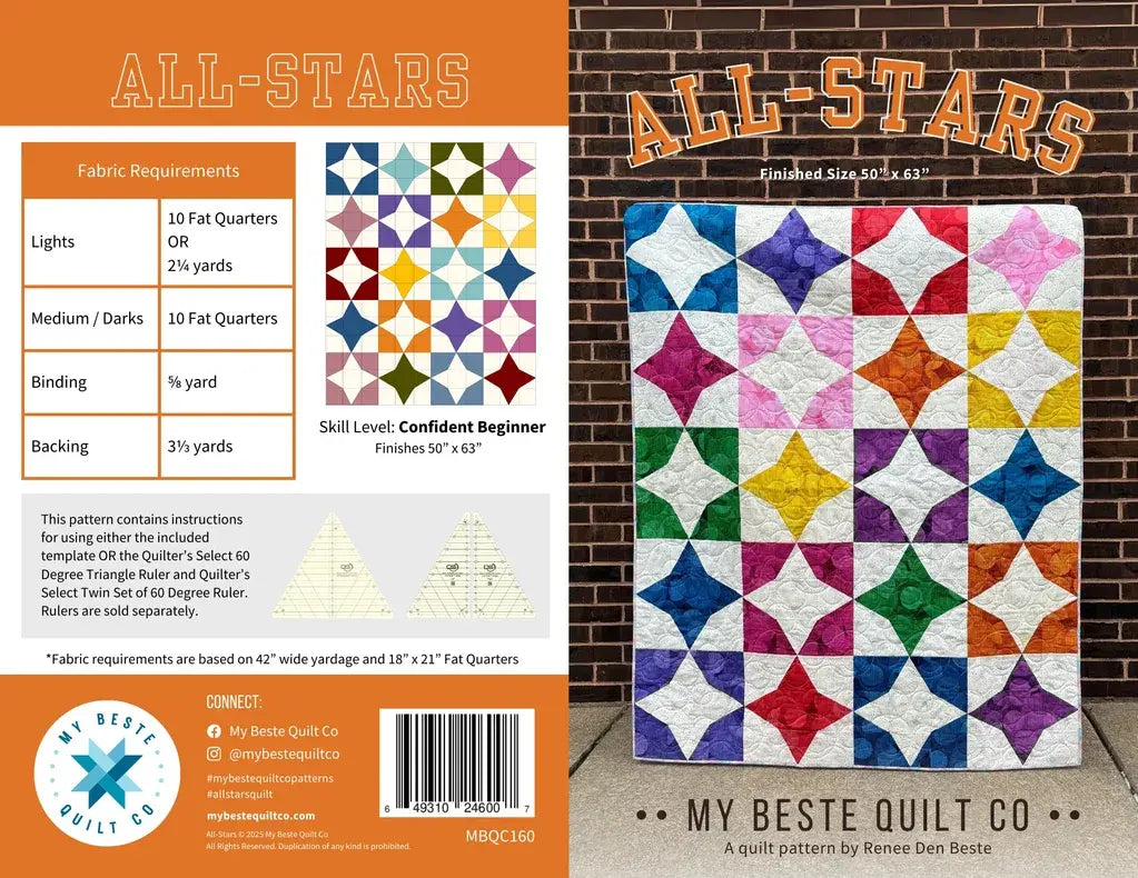 Unleash your creativity with the All-Stars Quilt Pattern by My Beste Quilt Co. Perfect for confident beginners, this vibrant quilt finishes at a cozy 50" x 63", making it an ideal project for those looking to add a splash of color to their home. The pattern is both fat quarter and scrap friendly, allowing you to utilize your fabric stash efficiently. Featuring a charming array of star designs in a rainbow of hues, this quilt is a delightful addition to any room. The pattern includes clear instructions and can be crafted using either the included template or Quilter’s Select 60 Degree Triangle Ruler. Elevate your quilting skills and create a masterpiece that radiates warmth and personality.