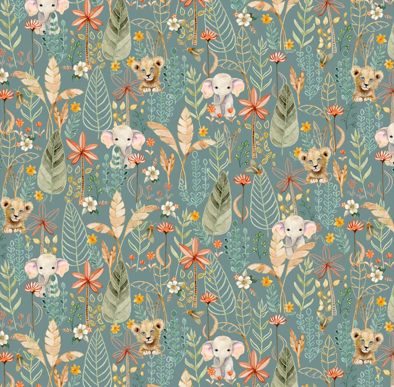 Bring a wild touch to your quilting projects with Mini Menagerie's charming animal allover print. This P&B Textiles design features adorable baby elephants and lion cubs nestled among lush foliage, all set against a soothing blue background. Perfect for nursery quilts, children's projects, or anyone who loves a playful pop of personality, this fabric combines whimsy with sophisticated color balance. Ideal for patchwork, appliqué, or as a delightful focal print.
