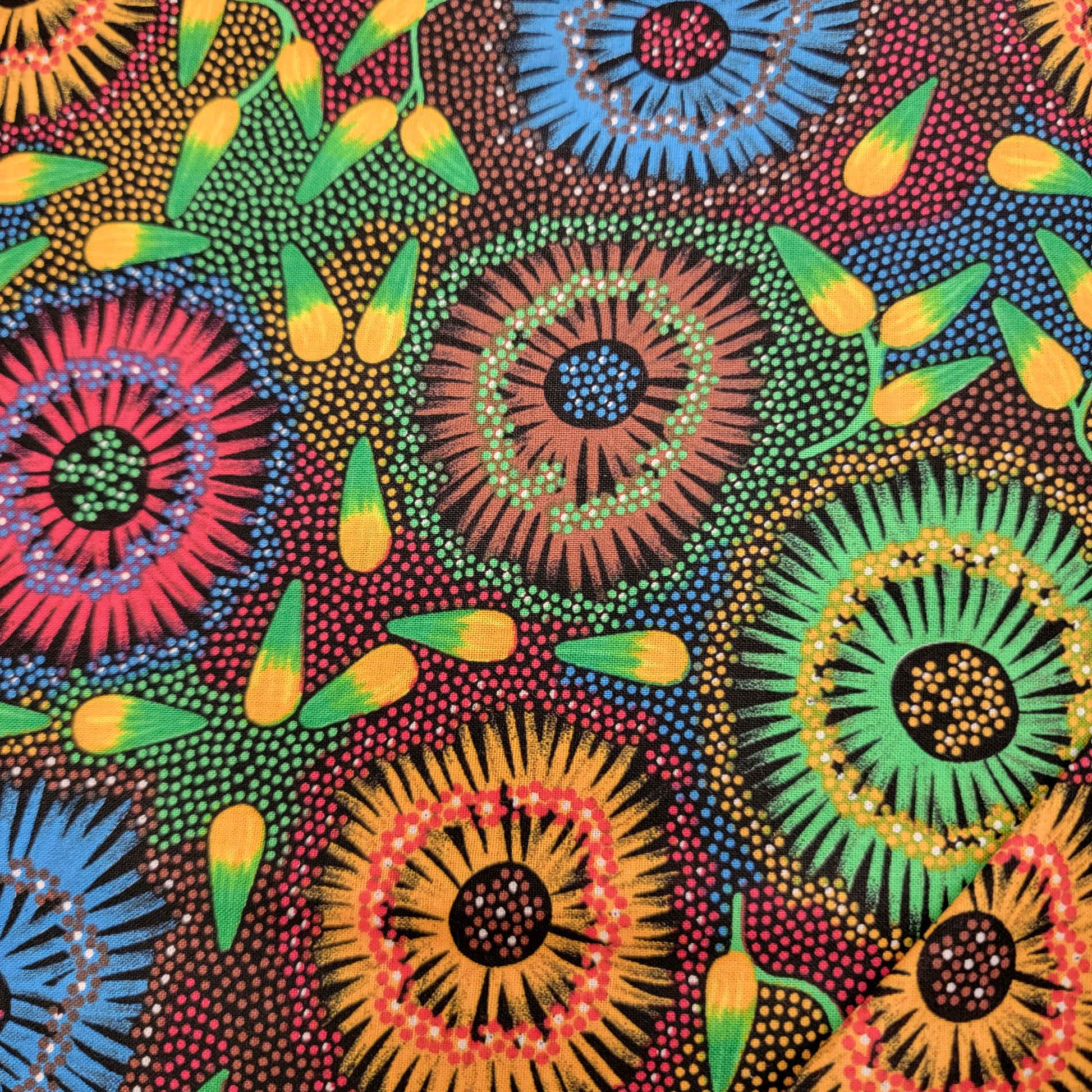 Add a splash of fun and culture to your quilting with the Wild Bush Banana - Multi fabric, showcasing lively Aboriginal prints that celebrate nature’s beauty. Its bright, dynamic patterns inspire creativity and bring a joyful touch to any project, making your quilting experience as playful as it is meaningful.