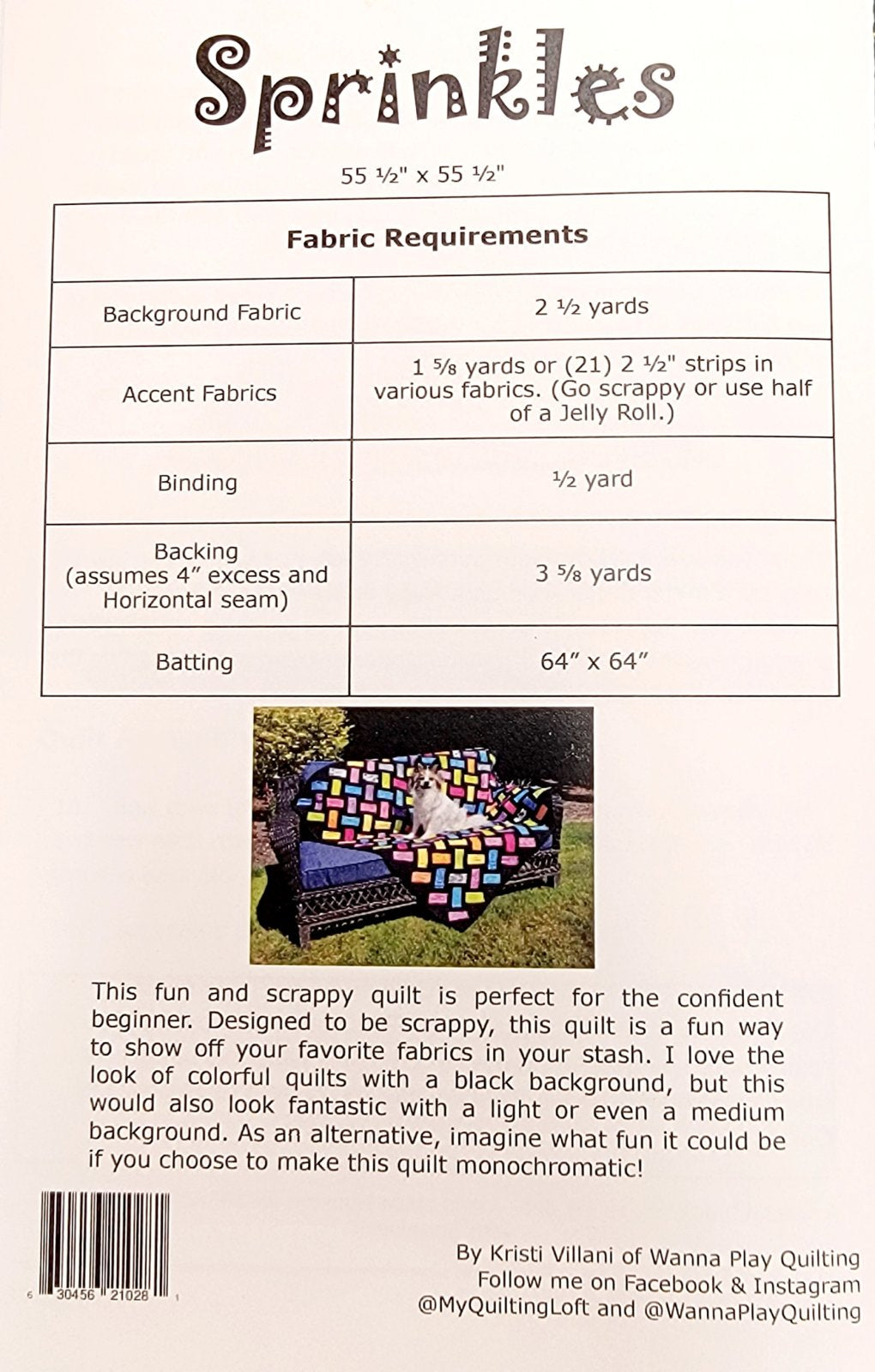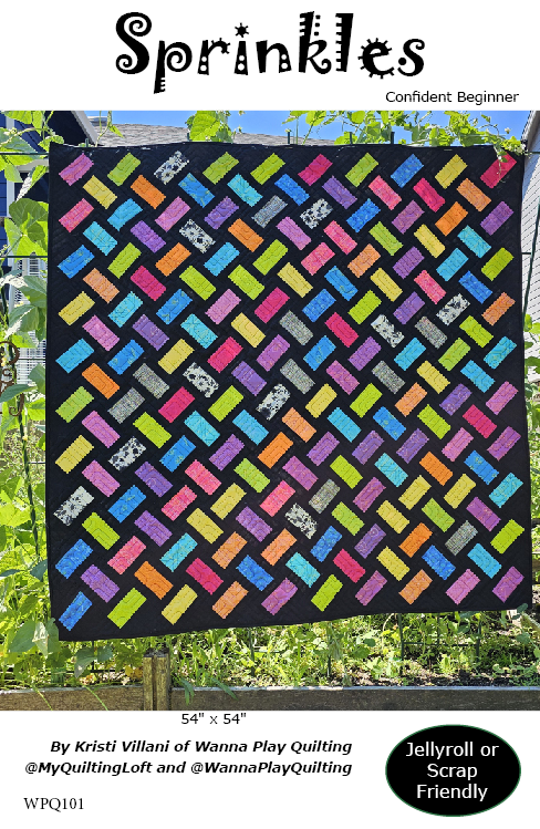 Unleash your creativity with the Sprinkles Quilt Pattern by Kristi Villani from Wanna Play Quilting. Perfect for confident beginners, this pattern invites you to craft a vibrant 54" x 54" masterpiece using your favorite Jelly Roll strips. The playful design, featuring a delightful array of colors set against a striking black background, is ideal for showcasing your fabric stash. Whether you opt for a scrappy look or a monochrome theme, this quilt promises to be a stunning addition to any space. Dive into the world of quilting and let your imagination run wild with Sprinkles!