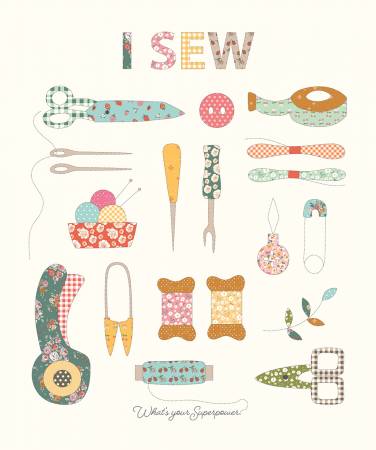 Unleash your creativity with the Sunsetridge 36in x 43in I Sew Panel by Riley Blake Designs. Perfect for sewing enthusiasts, this charming panel features a delightful array of vintage-inspired sewing tools, each adorned with whimsical floral patterns. The pastel palette of blues, pinks, and greens brings a soft, nostalgic touch to any project. Whether you're crafting a quilt, wall hanging, or tote bag, this panel adds a unique, artistic flair to your creations. Measuring 36 inches by 43 inches, it's the ideal size for a variety of projects. Elevate your sewing experience and let your imagination run wild with this enchanting panel. What's your superpower? Sewing, of course!