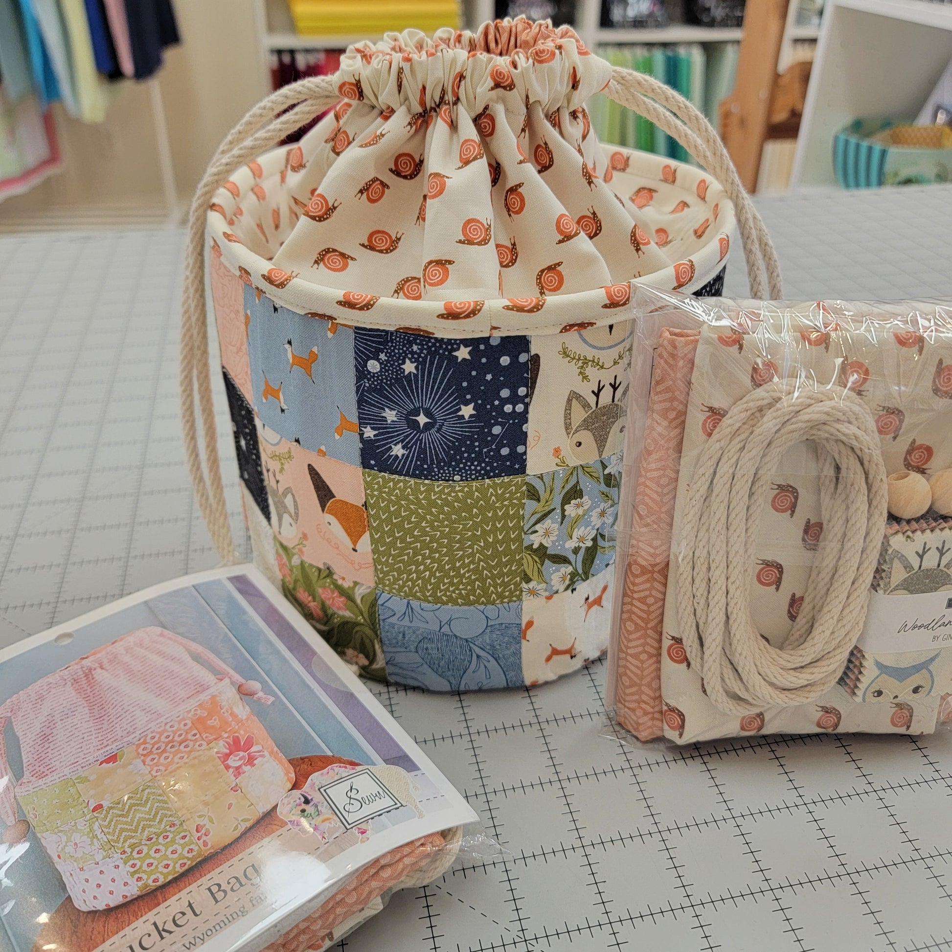 Our January Pouch Club project now available to all. This kit includes the pattern, fabric, and notions to create this adorable Bucket Bag. We've included both wooden beads for the fabric ties option, and cording is another option for the ties. Also included for added simplicity, Ten Sisters fusible grid.